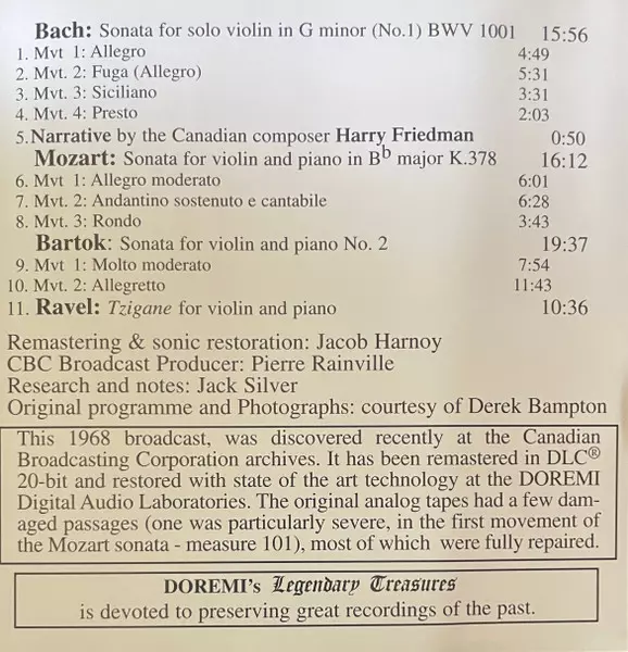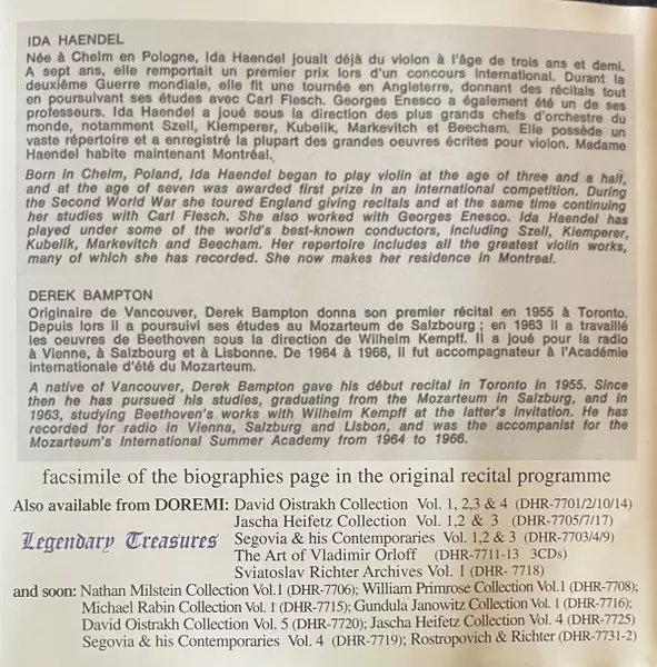 | Artista | Johann Sebastian Bach | Wolfgang Amadeus Mozart | Maurice Ravel | Ida Haendel | Béla Bartók |