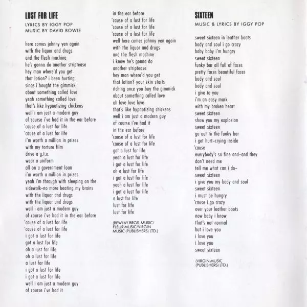 "Lust For Life" bylo druhé ze tří alb, která Iggy Pop vydal v roce 1977. Po rozpadu skupiny The Stooges vydal své první album "The Idiot". S následným albem "Lust For Life", které produkoval David Bowie, se mu podařilo získat uznání jako seriózní umělec.