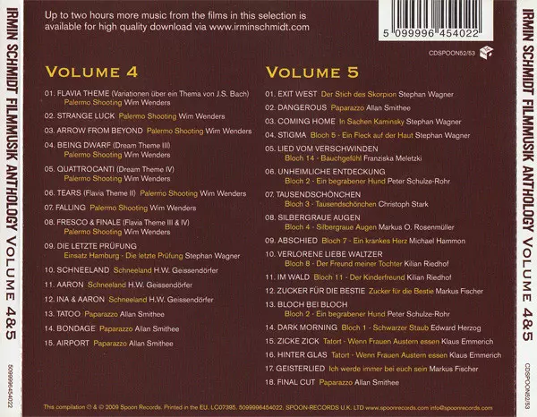 Irmin Schmidt: Filmmusik Anthology Volume 4 & 5 versione su 2CD in standard edizione. Questa particolare edizione è stata pubblicata in REGNO UNITO nella casa editrice Spoon Records in data 20. maggio 2016. Album comprende generi Palcoscenico e schermo e Soundtrack.