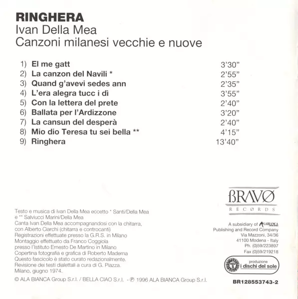 | Casa editrice | Bravø Records | I Dischi Del Sole | Ala Bianca Group S.r.l. | Bella Ciao S.r.l. |