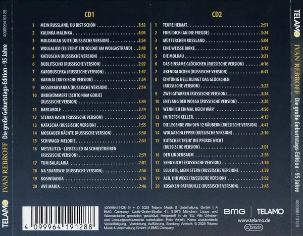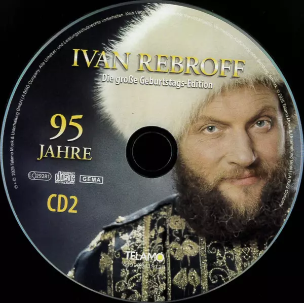 Ivan Rebroff: Die Große Geburtstag-Edition - 95 Jahre versione su 2CD in standard edizione. Questa particolare edizione è stata pubblicata in Germania nella casa editrice TELAMO anno 2025. Album può essere classificato come un genere Folk, World, & Country.
