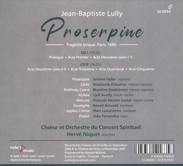 Hervé Niquet: Proserpine versione su 2CD in standard edizione. Questa particolare edizione è stata pubblicata in Europa nella casa editrice Glossa in data 15. agosto 2025. Album comprende generi Musica classica, Musica barocca e Opera.