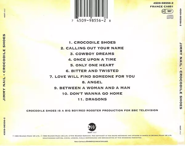 Jimmy Nail: Crocodile Shoes versione su CD in standard edizione. Questa particolare edizione è stata pubblicata in Europa nella casa editrice EastWest anno 1994. Album comprende generi Rock, Pop, Pop Rock, Country-Rock e Soft Rock.