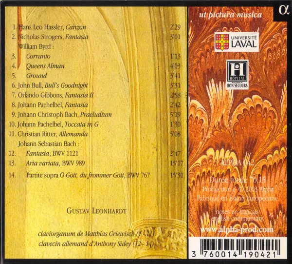 | Artista | Johann Sebastian Bach | Johann Pachelbel | William Byrd | Gustav Leonhardt | Orlando Gibbons | John Bull | Hans Leo Haßler | Nicholas Strogers | Christian Ritter |