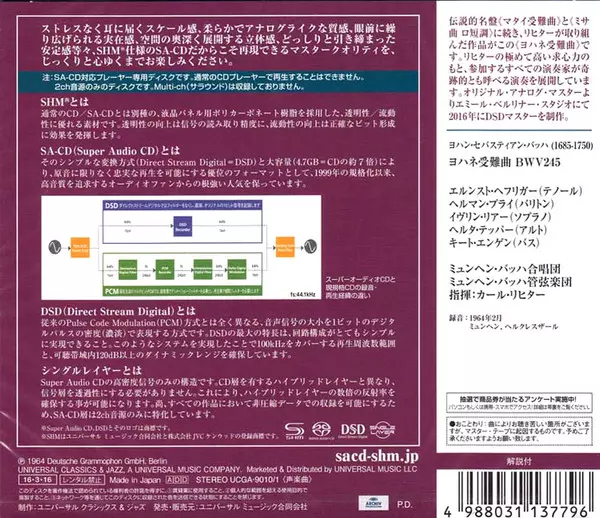Johann Sebastian Bach: Johannes-Passion LTD versione su 2SACD in limitati rimasterizzati edizione. Questa particolare edizione è stata pubblicata in Giappone nella casa editrice Archiv Produktion in data 25. marzo 2016. Album comprende generi Musica classica, Musica barocca e Religious.
