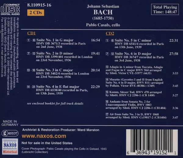 | Artista | Johann Sebastian Bach | Pablo Casals |