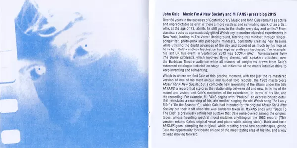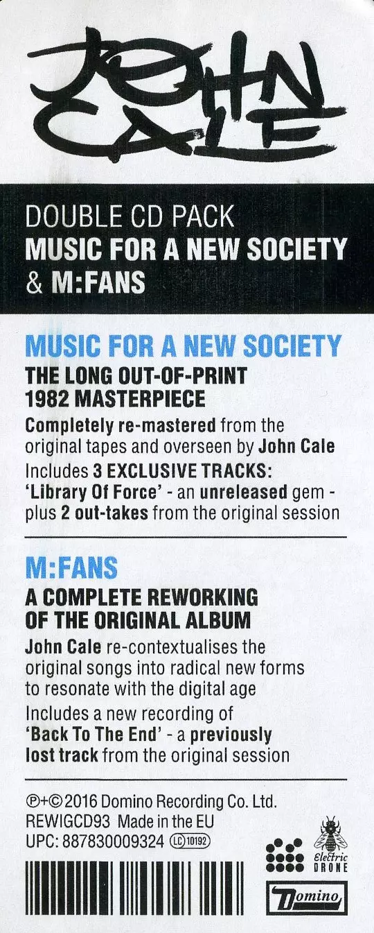 John Cale: Music For A New Society / M:FANS versione su 2CD in rimasterizzati edizione. Questa particolare edizione è stata pubblicata in Europa e Regno Unito nella casa editrice Domino in collaborazione con Electric Drone in data 5. febbraio 2016. Album comprende generi Rock, New Wave e Art Rock.