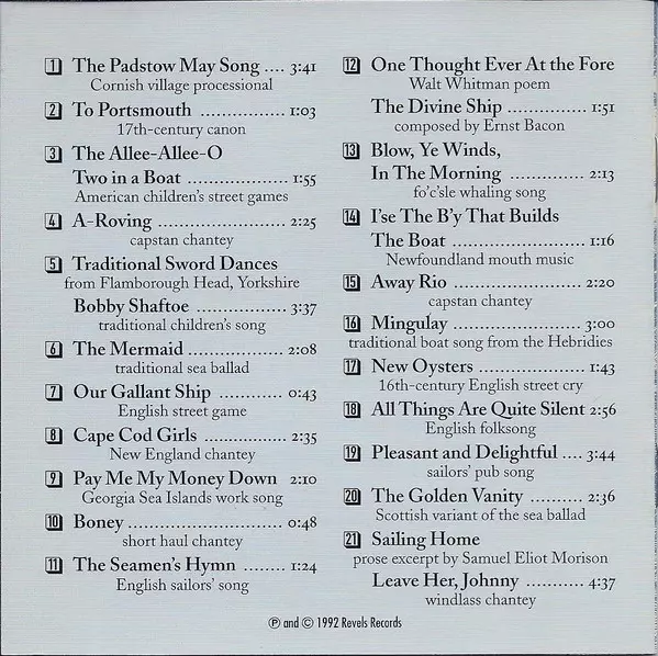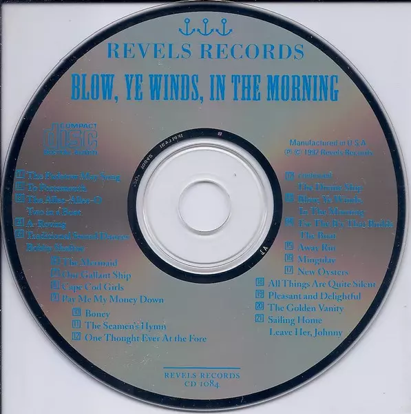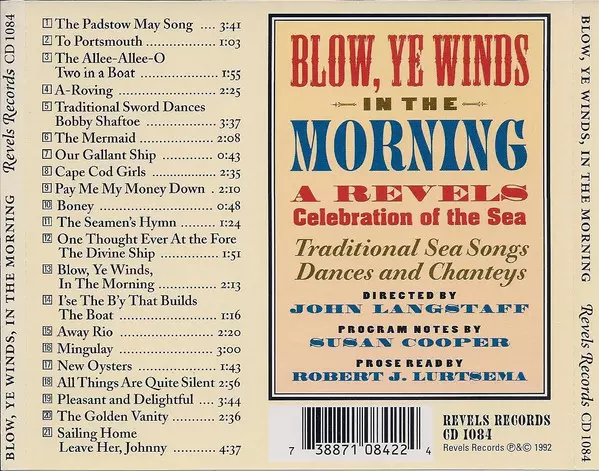 John Langstaff: Blow, Ye Winds, In The Morning (A Celebration Of The Sea) versione su CD in standard edizione. Questa particolare edizione è stata pubblicata in Stati Uniti nella casa editrice Revels Records in data 21. marzo 1995. Album comprende generi Folk, World, & Country, Non-Music, I bambini, Folk e Parola parlata.