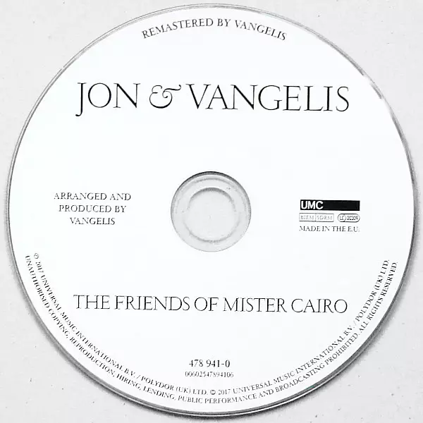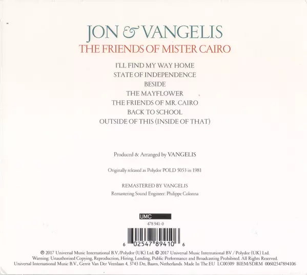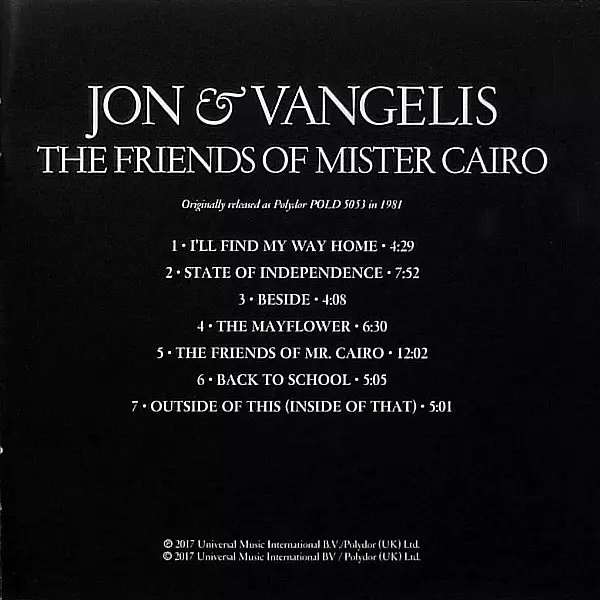 The Friends of Mr Cairo is an album by Jon & Vangelis , released in 1981. The album reached number 7 in the UK Albums Chart. The album was awarded a UK Phonographic Industry Silver Certificate on 1 July 2014 for selling over 60,000 copies in the United Kingdom. The album spawned three singles, "I'll Find My Way Home", "The Friends of Mr Cairo" a...