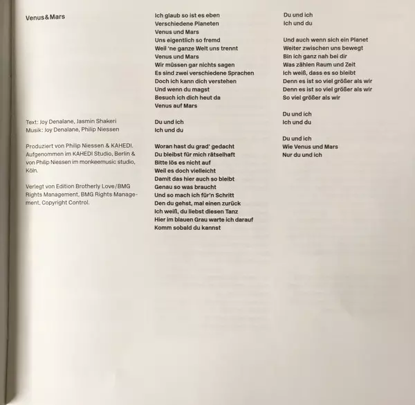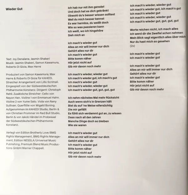 Lyrics By Alexander Zuckowski, Joy Denalane, Martin Fliegenschmidt | Music By Alexander Zuckowski, Benjamin Bazzazian, David Jürgens, Joy Denalane, Martin Fliegenschmidt | Producer Benjamin Bazzazian, KAHEDI | Producer [Additional Production] Derek von Krogh | Recorded By [Additional Instruments] Derek von Krogh