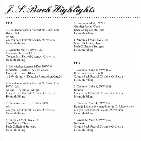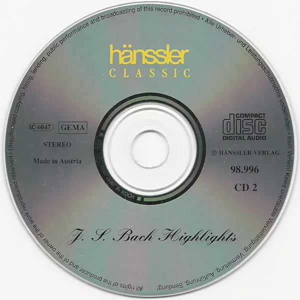 Johann Sebastian Bach: J.S. Bach Highlights versione su 2CD in standard edizione. Questa particolare edizione è stata pubblicata in Germania nella casa editrice Hänssler Classic in data 9. dicembre 1999. Album comprende generi Musica classica e Musica barocca.