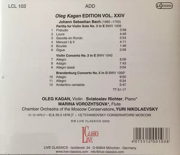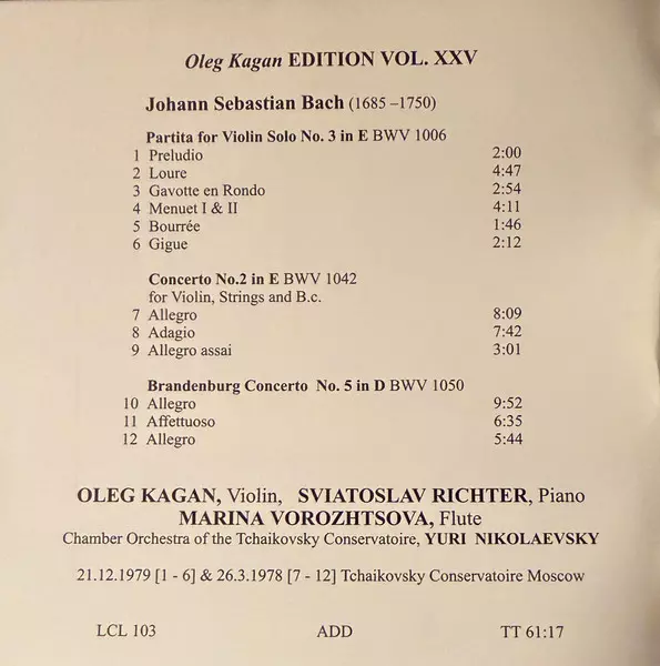 | Titolo | Partita For Solo Violin No. 3 In E BWV 1006 / Violin Concerto No. 2 In E BWV 1042 / Brandenburg Concerto No. 5 In D BWV 1050 |
