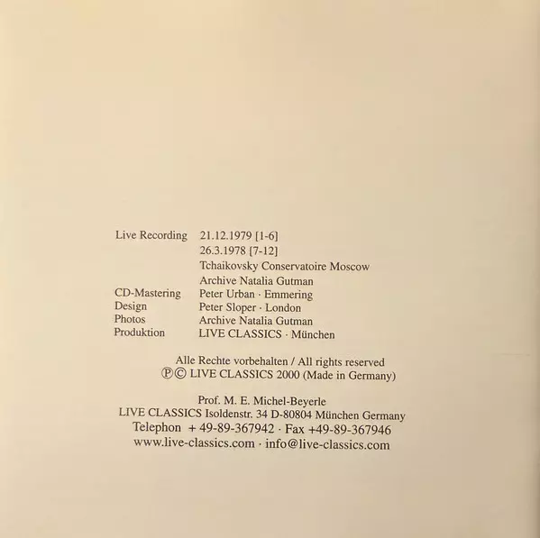 | Conductor Yuri Nikolayevsky | Flute Марина Ворожцова | Orchestra Moscow Conservatory Chamber Orchestra | Piano Sviatoslav Richter | ||