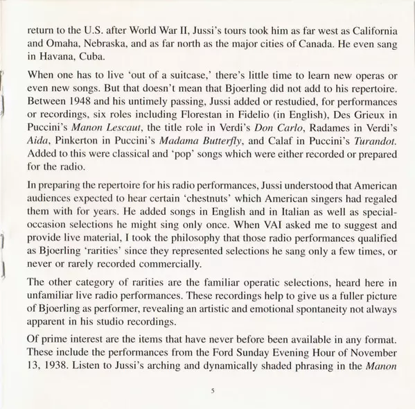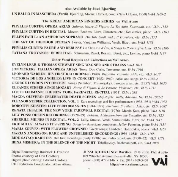 Jussi Björling: Rarities versione su CD in standard edizione. Questa particolare edizione è stata pubblicata in Stati Uniti nella casa editrice VAI Audio in data 6. giugno 2000. Album comprende generi Musica classica, Il romanticismo, Opera, Art Song e Lied.