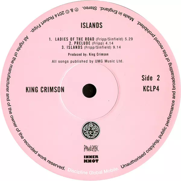 DGM & Panegyric present "Islands", the sixth track in a series of quality vinyl reissues. The album returns to 12" vinyl format and was created from a freshly cut master personally signed by mastering engineer Robert Fripp. The album is pressed on 200gram vinyl and housed in a reprint of the original sleeve, on which the lyrics are printed. Isla...