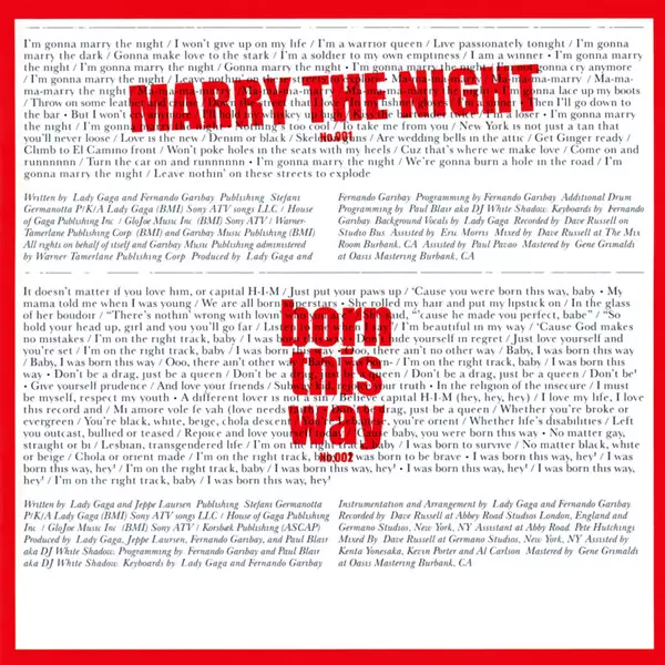 Arranged By [Vocals], Backing Vocals, Instruments, Programmed By [Instruments] RedOne | Edited By [Vocals] RedOne, Trevor Muzzy | Guitar, Mixed By Trevor Muzzy | Mastered By Gene Grimaldi | Recorded By, Engineer Dave Russell, RedOne, Trevor Muzzy | Saxophone Clarence Clemons | Written-By, Producer Lady Gaga, RedOne