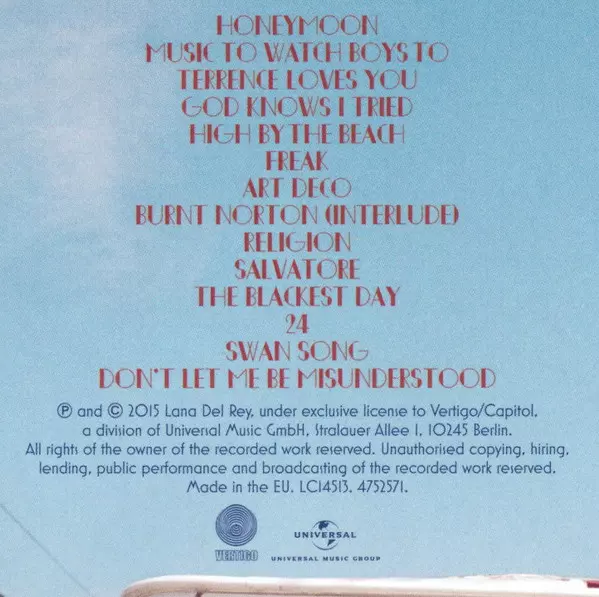 Lana Del Rey: Honeymoon versione su CD in standard edizione. Questa particolare edizione è stata pubblicata in Europa nella casa editrice Vertigo in collaborazione con Universal Music Group in data 2. ottobre 2015.