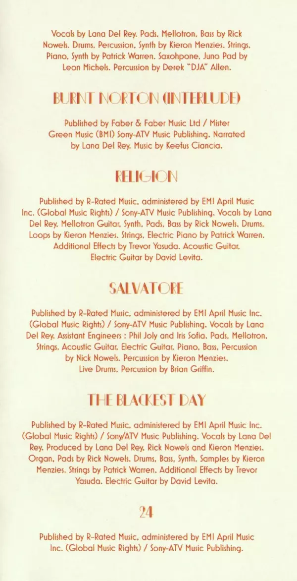 Engineer Chris Garcia (5), Trevor Yasuda | Engineer, Producer, Mixed By, Drums, Bass, Sampler [Samples] Kieron Menzies | Mastered By Adam Ayan | Written-By, Producer, Electric Guitar, Organ, Synthesizer [Pads], Electric Piano, Mellotron Rick Nowels | Written-By, Vocals, Producer Lana Del Rey
