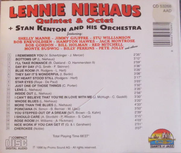 | Artista | Stan Kenton And His Orchestra | The Lennie Niehaus Octet | Lennie Niehaus Quintet |