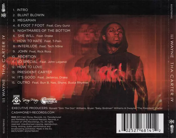 Lil Wayne: Tha Carter IV versione su CD in standard edizione. Questa particolare edizione è stata pubblicata in Europa nella casa editrice Cash Money Records in collaborazione con Universal Republic Records in data 29. agosto 2011. Album comprende generi Hip Hop e Gangsta.