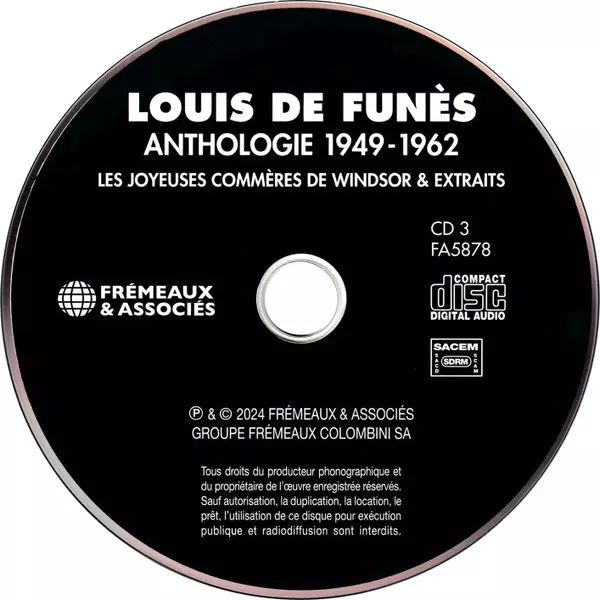 Louis De Funès: Anthologie 1949-1962 versione su 3CD in standard edizione. Questa particolare edizione è stata pubblicata in Francia nella casa editrice Frémeaux & Associés in data 7. febbraio 2025. Album comprende generi Palcoscenico e schermo, Non-Music, Radioplay, Komedie, Cabaret e Vaudeville.