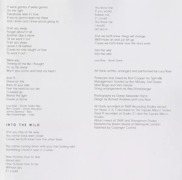 Bass Johnny Seymour (2) | Drums, Percussion Rich Cooper (2) | Strings Alex Eichenberger, Helen Sanders-Hewett, Michael Christopher Reed, Rebecca Gardiner | Vocals, Guitar, Piano Lucy Rose