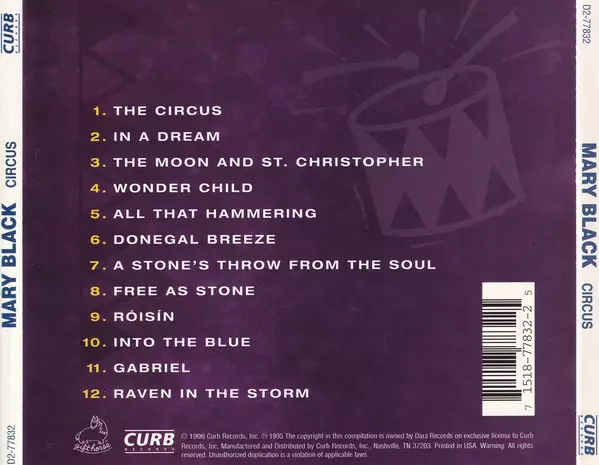 Mary Black: Circus versione su CD in standard edizione. Questa particolare edizione è stata pubblicata in Stati Uniti nella casa editrice Curb Records in data 17. settembre 1996. Album può essere classificato come un genere Folk, World, & Country. Us Version.