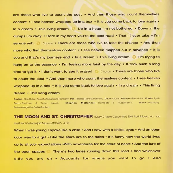 Arranged By [Brass Arranged By] Carl Geraghty, Stephen McDonnell | Baritone Saxophone, Tenor Saxophone Carl Geraghty | Bass Guitar Garvan Gallagher | Drums Dave Early | Electric Piano [Rhodes], Harmony Vocals Pat Crowley | Harmony Vocals Mary Black | Slide Guitar, Acoustic Guitar, Harmony Vocals Declan Sinnott | Synth Frank Gallagher | Trumpet, Flugelhorn Stephen McDonnell | Written-By Noel Brazil