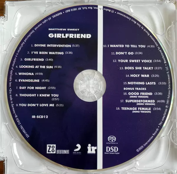 Matthew Sweet: Girlfriend versione su SACD in rimasterizzati edizione. Questa particolare edizione è stata pubblicata in Stati Uniti nella casa editrice Intervention Records in collaborazione con Zoo Entertainment e Sony Music Commercial Music Group in data 11. dicembre 2020. Album comprende generi Rock, Indie Rock e Pop Rock. SACD.
