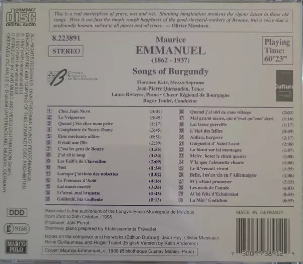 | Artista | Maurice Emmanuel | Florence Katz | Jean-Pierre Quenaudon | Laure Rivierre | Chœur Régional De Bourgogne | Roger Toulet |