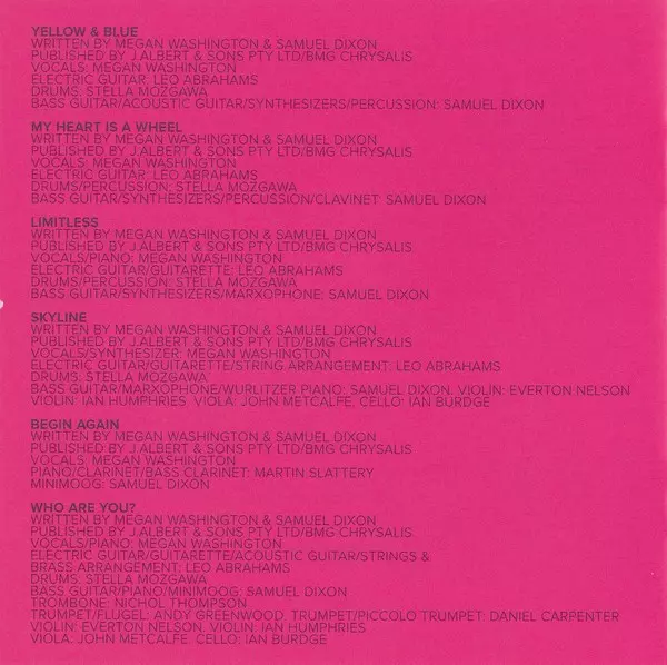 Bass Guitar, Synthesizer, Omnichord Sam Dixon | Drums, Percussion Stella Mozgawa | Electric Guitar, Guitaret [Guitarette], Piano Leo Abrahams | Vocals Megan Washington | Written-By Megan Washington, Sam Dixon
