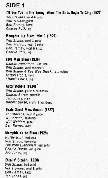 Guitar Charlie Burse | Harmonica Will Shade | Jug Jab Jones | Vocals, Banjolin [Banjo-Mandolin] Vol Stevens | Vocals, Harmonica Charlie Nickerson