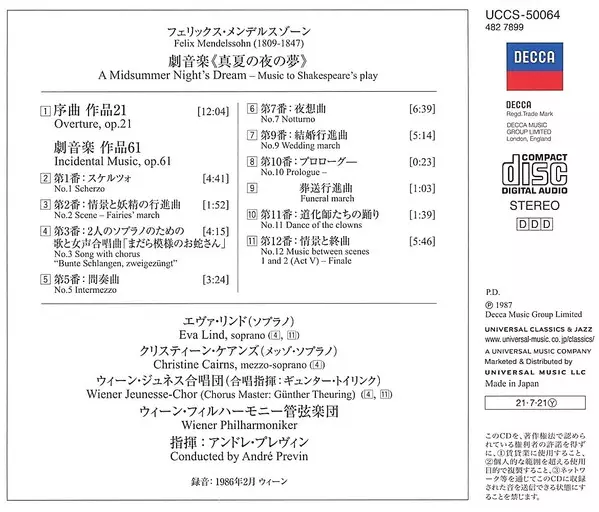Artista | Wiener Philharmoniker | André Previn | Felix Mendelssohn-Bartholdy | Eva Lind | Wiener Jeunesse-Chor | Christine Cairns |