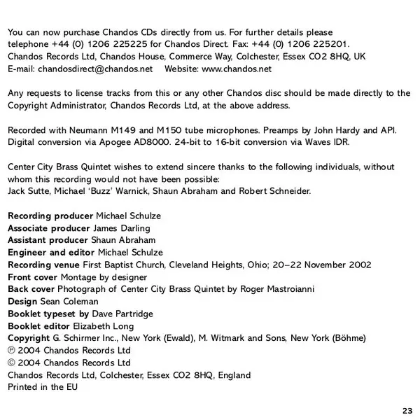 | Artista | Felix Mendelssohn-Bartholdy | Victor Ewald | Center City Brass Quintet | Oskar Wilhelmovitch Böhme |