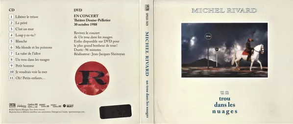 Michel Rivard: Un Trou Dans Les Nuages versione su CD/DVD in standard edizione. Questa particolare edizione è stata pubblicata in Canada nella casa editrice Spectra Musique in data 3. aprile 2012. Album comprende generi Pop, Ballata e Chanson.