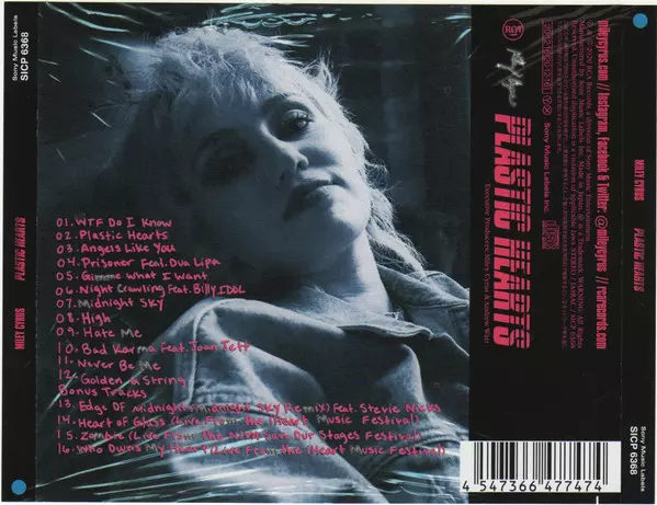 Miley Cyrus: Plastic Hearts versione su CD in standard edizione. Questa particolare edizione è stata pubblicata in Giappone nella casa editrice RCA in data 26. febbraio 2021. Album comprende generi New Wave, Pop Rock, Synth-Pop, Power Pop e Adult Contemporary.