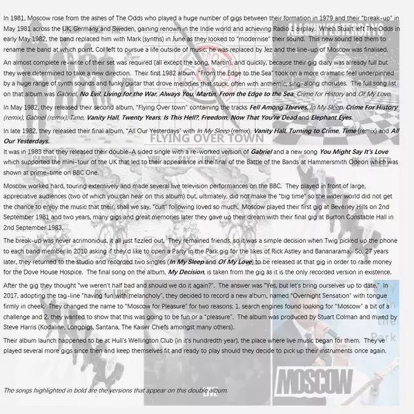 Moscow: Too Light To Be Late CLR versione su vinile 2LP in colorati edizione. Questa particolare edizione è stata pubblicata in REGNO UNITO nella casa editrice Bin Liner Records in data 31. ottobre 2025. Album comprende generi Rock, Post-Punk e Indie Rock.