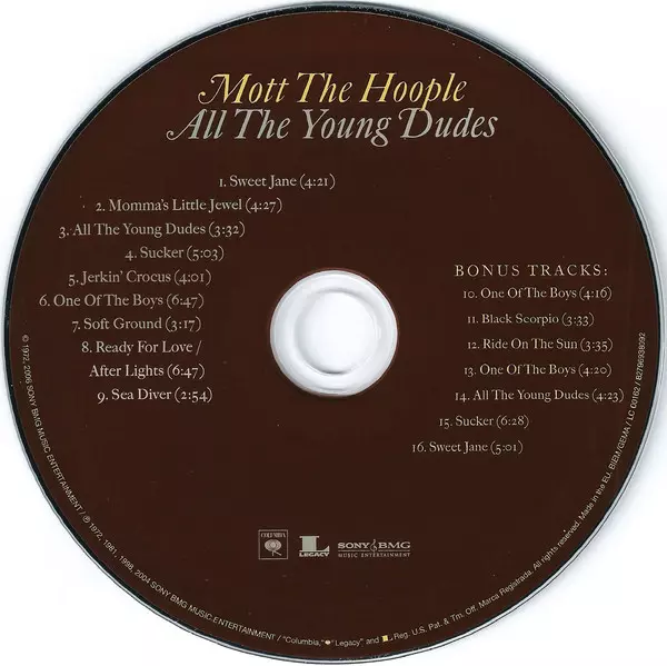 Mott The Hoople: All The Young Dudes versione su CD in rimasterizzati edizione. Questa particolare edizione è stata pubblicata in Europa nella casa editrice Columbia in collaborazione con Legacy e Sony BMG Music Entertainment in data 2. giugno 2006. Album comprende generi Rock, Classic Rock e Glam.
