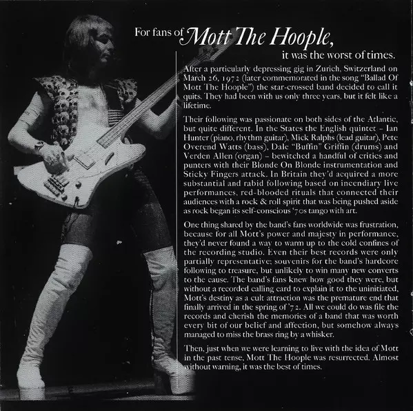 Mott The Hoople was a British rock band that achieved considerable fame in the early 1970s. Formed in 1969, the group was originally led by vocalist and pianist Ian Hunter and included members such as Mick Ralphs on guitar, Pete Overend Watts on bass, Dale Griffin on drums, and Ver...