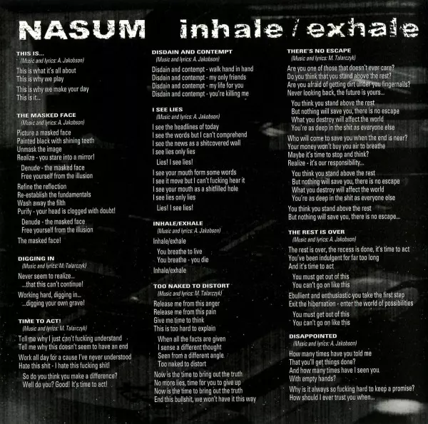 Nasum was a Swedish grindcore band formed in 1992 by guitarist Mieszko Talarczyk and drummer Anders Jakobson. The band's name is derived from the Latin word for "nose," and they quickly became known for their intense, fast-paced music and political lyrics. Nasum released a series o...