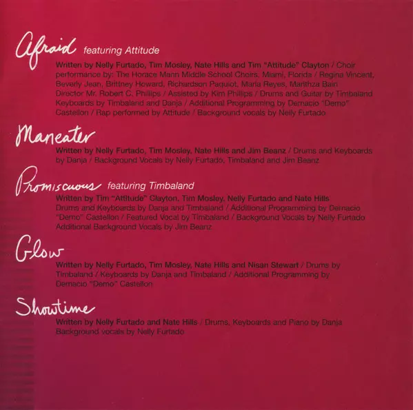 Choir [The Horace Mann Middle School Choirs] Beverly Jean, Brittney Howard, Maria Reyes, Marithza Bain, Regina Vincent, Richardson Paquiot | Directed By [Assisted By] Kim Phillips | Directed By [Choir Director] Mr. Robert C. Phillips | Drums, Guitar [Guitar By] Timbaland | Engineer [Second Engineered By] Ben Jost, James Roach, Kobla Tetey, Vadim Chislov | Featuring Attitude (2) | Keyboards [Keyboards By] Danja, Timbaland | Lyrics By [All Lyrics By] Nelly Furtado | Performer [Choir Performance By] The Horace Mann Middle School Choirs | Producer [All Songs Produced By] Timbaland | Producer [All Vocal Production By] Jim Beanz | Producer [Produced By] Danja | Programmed By [Additional Programming By] Demacio "Demo" Castellon | Rap [Rap Performed By], Performer [Rap Performed By] Attitude (2) | Recorded By [All Recording], Engineer [Engineering], Mixed By [Mixing By] Demacio "Demo" Castellon | Recording Supervisor [Additional Recording By] Marcella Araica | Written By Tim "Attitude" Clayton | Written-By Nate Hills, Nelly Furtado, Tim Clayton, Timothy Mosley