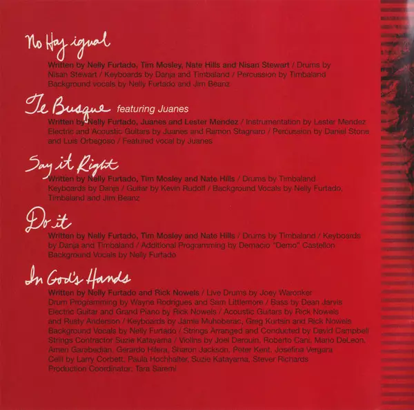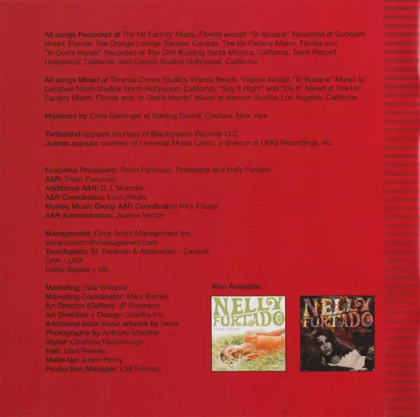 Backing Vocals [Background Vocals By] Nelly Furtado | Drums [Drums By] Timbaland | Engineer [Second Engineered By] Ben Jost, James Roach, Kobla Tetey, Vadim Chislov | Keyboards [Keyboards By] Danja, Timbaland | Lyrics By [All Lyrics By] Nelly Furtado | Producer [All Songs Produced By] Danja, Timbaland | Producer [All Vocal Production By] Jim Beanz | Programmed By [Additional Programming By] Demacio "Demo" Castellon | Recorded By [Additional Recording By] Marcella Araica | Recorded By [All Recording], Engineer [Engineering], Mixed By [Mixing By] Demacio "Demo" Castellon | Written By Nelly Furtado, Tim Mosley And Nate Hills | Written-By Nate Hills, Nelly Furtado, Timothy Mosley