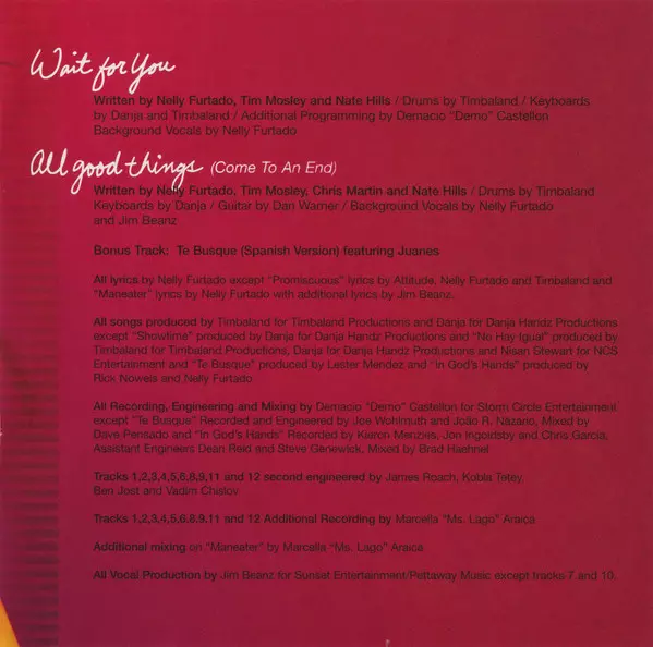 Backing Vocals [Background Vocals By] Jim Beanz, Nelly Furtado, Timbaland | Drums, Keyboards [Keyboards By] Danja | Engineer [Second Engineered By] Ben Jost, James Roach, Kobla Tetey, Vadim Chislov | Lyrics By Nelly Furtado | Lyrics By [Additional Lyrics By] Jim Beanz | Mixed By [Additional Mixing By] Marcella Araica | Producer [All Songs Produced By] Danja, Timbaland | Producer [All Vocal Production By] Jim Beanz | Recorded By [Additional Recording By] Marcella Araica | Recorded By [All Recording], Engineer [Engineering], Mixed By [Mixing By] Demacio "Demo" Castellon | Written By Nelly Furtado, Tim Mosley, Nate Hills And Jim Beanz | Written-By Jim Beanz, Nate Hills, Nelly Furtado, Timothy Mosley