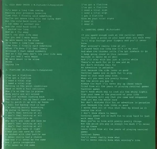 Acoustic Guitar Sean Kelly (6) | Keyboards, Guitar John Congleton | Piano, Keyboards, Synthesizer Adam Pickrell | Synthesizer [Juno 60], Mellotron, Synthesizer [Mini Moog Model D (Bass)] Bobby Sparks | Written-By John Congleton, Nelly Furtado