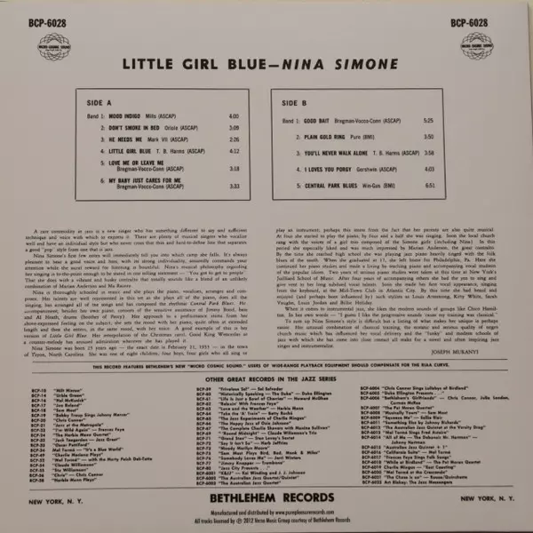 "Little Girl Blue", released in 1957, was Nina Simone's first recording, originally released by Bethlehem. Accompanied by bassist Jimmy Bond and Albert "Tootie" Heath, Simone showcases her mysterious and sultry-sounding melodic voice, a lively and confident jazz style, and a mysterious yet down-to-earth sensibility. The album also features an ou...