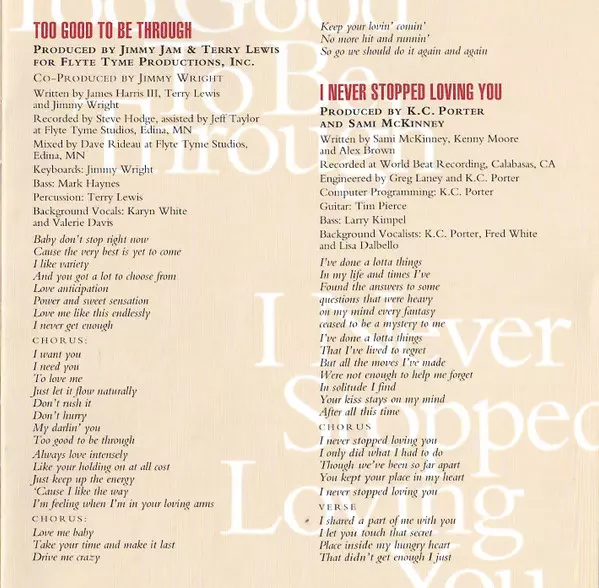 Backing Vocals Karyn White, Valerie Davis | Bass Mark Haynes | Keyboards James "Big Jim" Wright | Percussion Terry Lewis | Written-By Jimmy Jam & Terry Lewis