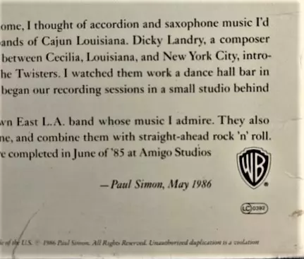 Acoustic Guitar Paul Simon | Bass Conrad Lozano | Drums Louie Perez | Drums [Additional Drums] Steve Gadd | Engineer [Assistant Engineer, Amigo Studios] Steven Strassman | Featuring [With] Los Lobos | Guitar Cesar Rosas | Guitar, Accordion David Hidalgo | Saxophone Steve Berlin | Vocals Cesar Rosas, David Hidalgo, Paul Simon | Words By, Music By Paul Simon