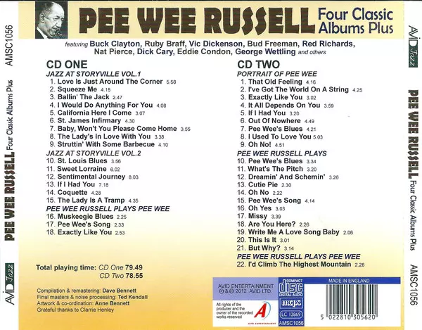 Pee Wee Russell: Four Classic Albums Plus versione su 2CD in rimasterizzati edizione. Questa particolare edizione è stata pubblicata in REGNO UNITO nella casa editrice Avid Jazz in collaborazione con Avid Entertainment in data 7. agosto 2019. Album comprende generi Jazz e Dixieland.