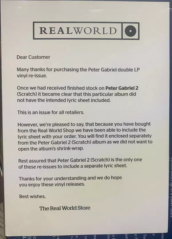 | Casa editrice | Real World Records | Charisma |