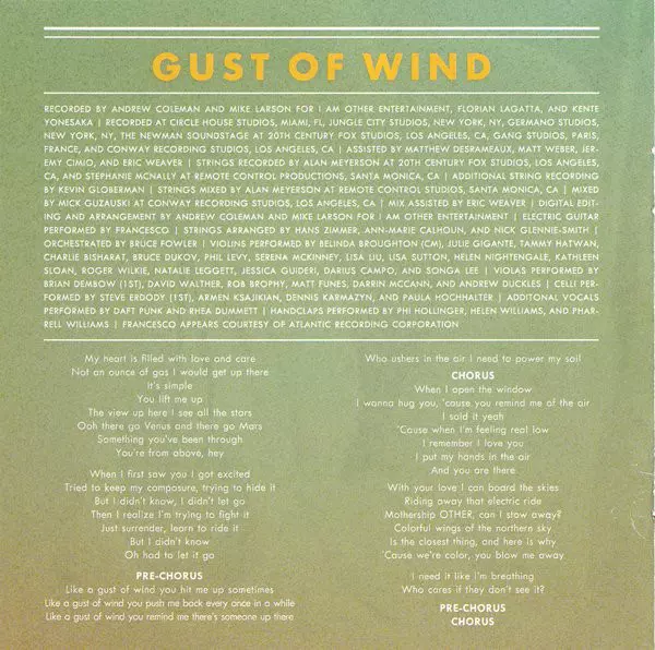 Arranged By [Strings] Ann Marie Calhoun, Hans Zimmer, Nick Glennie-Smith | Cello Armen Ksajikian, Dennis Karmazyn, Paula Hochhalter, Steve Erdody | Electric Guitar Francesco Yates | Mixed By Mick Guzauski | Mixed By [Assisted] Eric Weaver | Mixed By [Strings] Alan Meyerson | Orchestrated By Bruce Fowler (3) | Recorded By [Additional Strings] Kevin Globerman | Recorded By [Strings] Alan Meyerson, Stephanie McNally | Recorded By, Edited By, Arranged By Andrew Coleman (3), Mike Larson (4) | Viola Andrew Duckles, Brian Dembow, Darrin McCann, David Walther, Matt Funes, Robert Brophy | Violin Belinda Broughton, Bruce Dukov, Charlie Bisharat, Helen Nightengale, Jessica E. Guideri, Julie Gigante, Kathleen Sloan, Lisa Liu, Lisa Sutton, Natalie Leggett, Phillip Levy, Roger Wilkie, Serena McKinney, Tamara Hatwan | Vocals [Additional] Daft Punk, Rhea Dummett